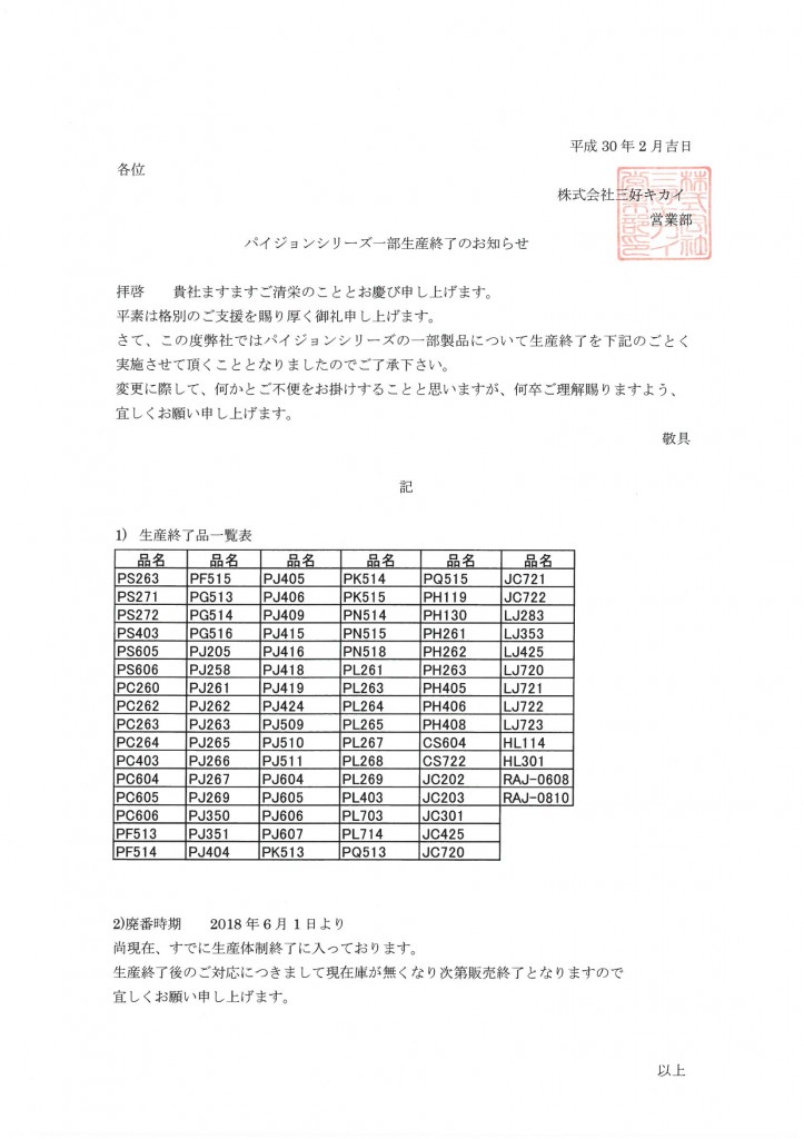 パイジョン製品一部製品終了のご案内 2018.02.14 パイジョンシリーズのうち、一部製品を生産終了にさせて頂く事となりました。 詳細につきましては下記をご参照ください。 一部製品の生産終了に伴い、ご迷惑をお掛けし大変申し訳ございませんが何卒、ご了承ください。