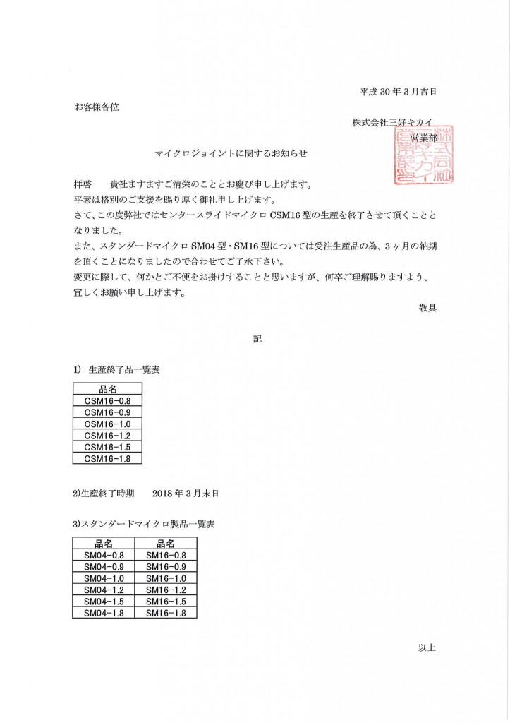 マイクロジョイントに関するお知らせ 2018.03.27 マイクロジョイントのうち、スタンダードマイクロCSM16型の生産を終了させて頂く事となりました。 またSM04型・SM16型は受注生産品の為、納期を頂くことになりました。 詳細につきましては下記をご参照ください。 変更に際して、何かとご不便をお掛けすると思いますが何卒、ご了承ください。