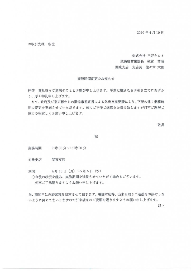 関東支店、業務時間変更のお知らせ 2020.04.10 新型コロナウイルスの感染拡大に伴い、 緊急事態宣言が発出されたことを受け 三好キカイ、関東支店の業務時間の変更を行います。 詳細については下記にてご参照ください。 ご理解の程、宜しくお願い致します。