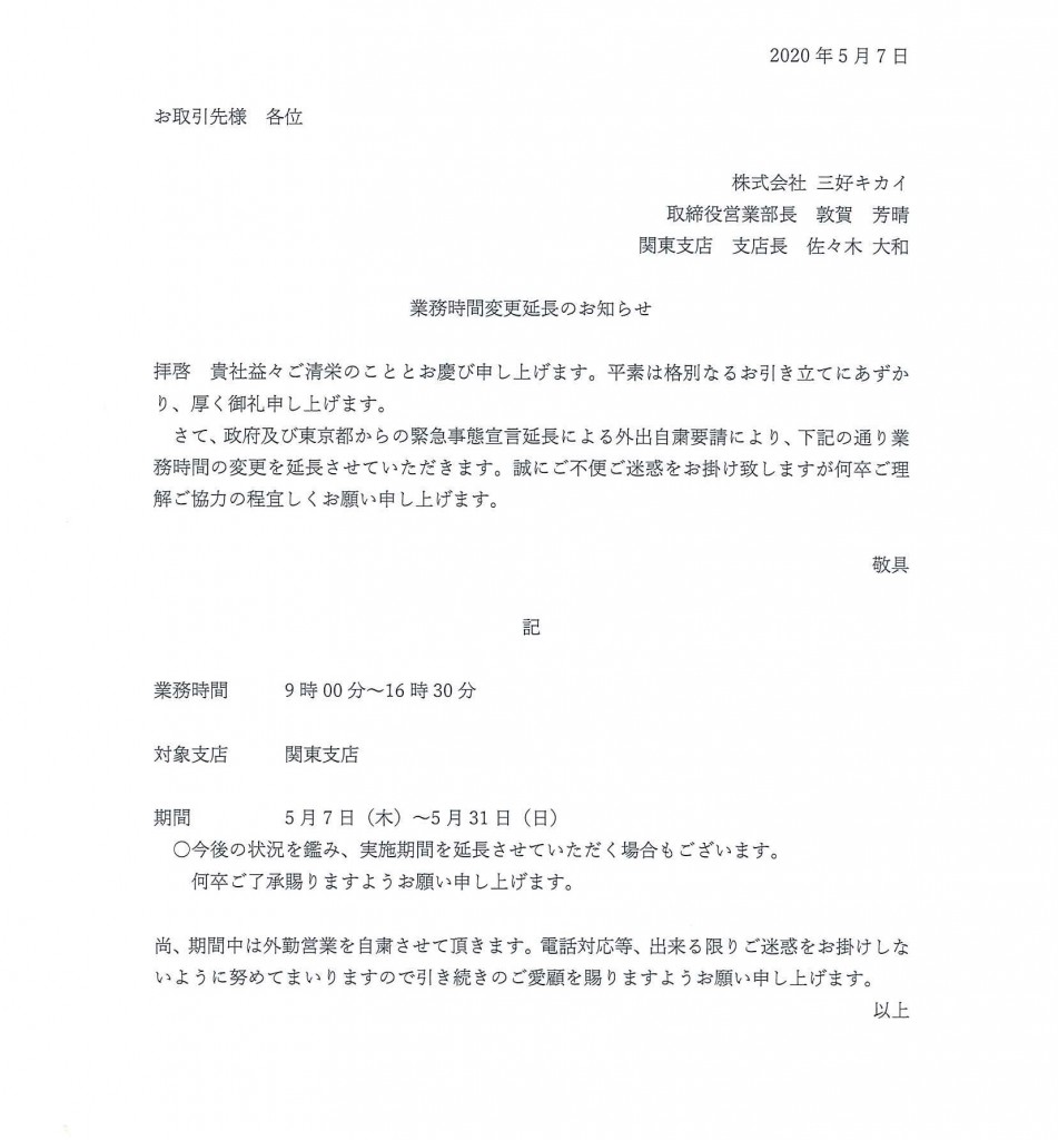 関東支店、業務時間変更延長のお知らせ 2020.05.08 新型コロナウイルスの感染拡大に伴い、 緊急事態宣言が延長されたことを受け 三好キカイ、関東支店の業務時間の変更の延長を行います。 詳細については下記にてご参照ください。 ご理解の程、宜しくお願い致します。